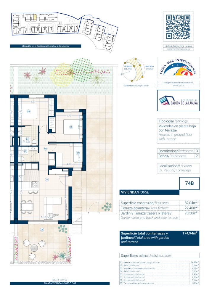 Leilighetene har 3 soverom og 2 bad med enten privat hage, eller takterrasse. Leilighetene selges fullt møblert med komplette kjøkken, belysning og innebygde garderober på alle soverom. Stilfulle bad med romslige dusjer og gulvvarme. Airconditioning i kanaler til alle rom og balansert ventilasjon. Leilighetene har høy energieffektivitet med aerotermisk varmepumpe og kvalitetsvinduer. Motoriserte persienner, pansret inngangsdør med video-porttelefon for trygghet.