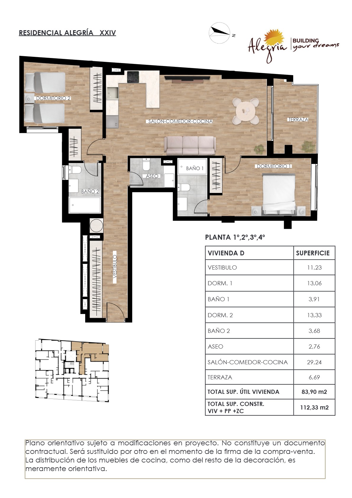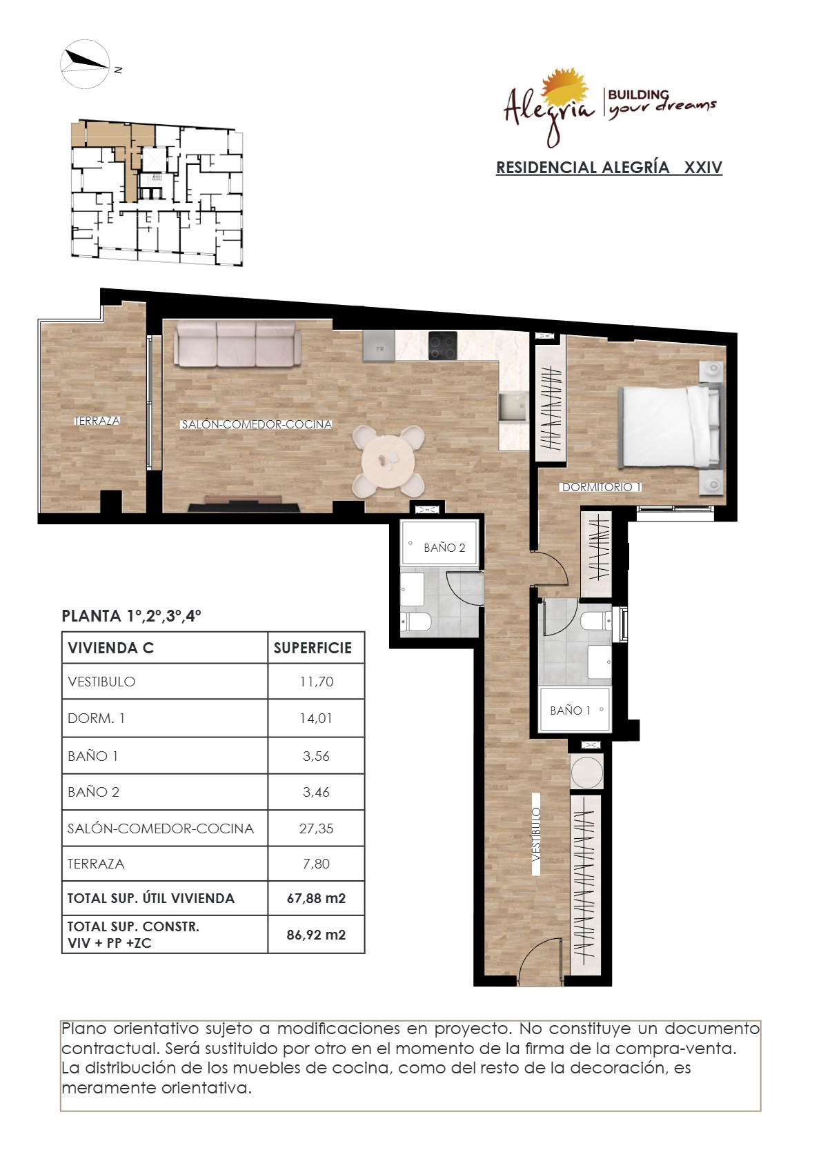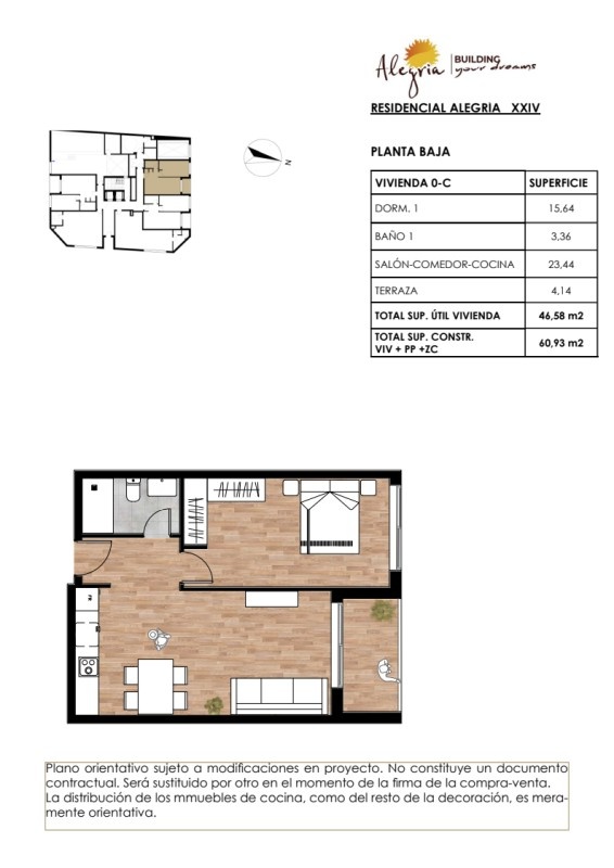 Boligene i Alegria 24 er nøye utformet for å tilby en høy standard og moderne bekvemmelighet. Hver enhet leveres med komplett kjøkkeninnredning med benkeplate i kvartskompositt og hvitevarer i rustfritt stål. Badene er fullt utstyrt med møbler, armaturer og dusjvegger. Videre inkluderer boligene innredede garderober med skyvedører, komplett belysning og elektrisk gulvvarme på badene. For optimal komfort er det forhåndsinstallasjon for kanalisert klimaanlegg og vinduer med doble, lavenergiglass for effektiv termisk og akustisk isolasjon. Sikkerheten ivaretas med motoriserte persienner, videoporttelefon og pansret inngangsdør.