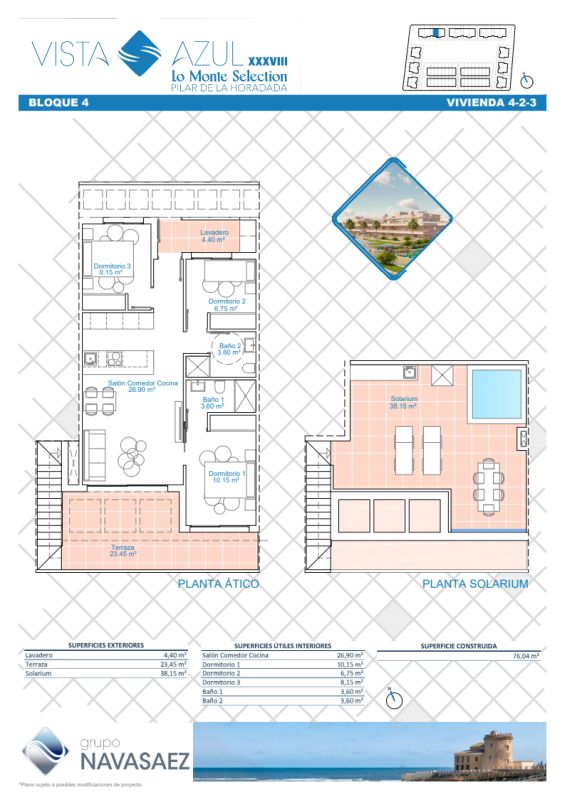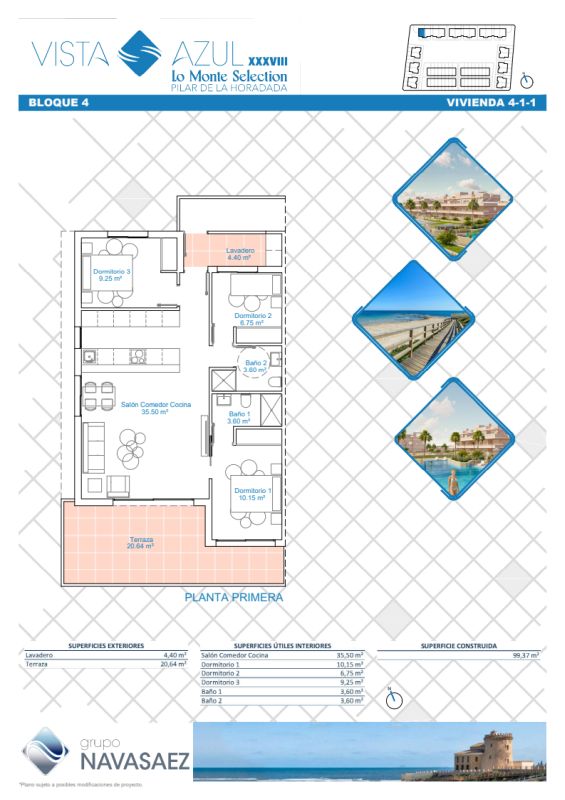 Welkom bij Vista Azul 38 Lo Monte, een exclusieve woonwijk in Pilar de la Horadada met moderne appartementen met 3 slaapkamers en 2 badkamers. Elke woning heeft ruime buitenruimtes zoals een tuin, terras of privédakterras, waar je de hele dag van de zon kunt genieten. De woningen zijn voorzien van volledig uitgeruste keukens, inclusief apparatuur, en de gemeenschappelijke ruimten omvatten een groot zwembad, kinderbad en weelderig groen.